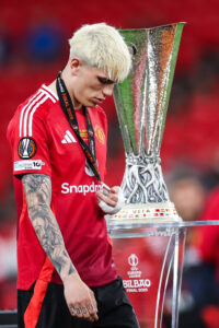 |   Bilbau, Espanha – 21 Maio: Garnacho (Manchester United) a passar ao lado da taça da Liga Europa, depois de perder a final. (Foto Pedro Reis – Estádio 11) |