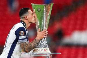 |   Bilbau, Espanha – 21 Maio: Pedro Porro (Tottenham) a beijar a taça após vencer a final. (Foto Pedro Reis – Estádio 11) |