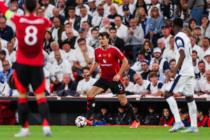|   Bilbau, Espanha – 21 Maio: Maguire (Manchester United) com a posse da bola, a tentar descobrir um colega de equipa disponível. (Foto Pedro Reis – Estádio 11) |