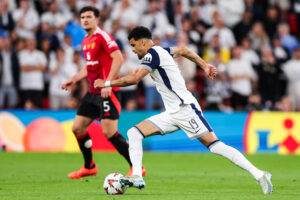 |   Bilbau, Espanha – 21 Maio: Solanke (Tottenham) a avançar com a bola controlada, perante o olhar de Maguire. (Foto Pedro Reis – Estádio 11) |