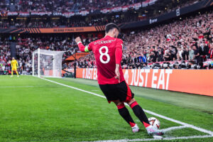|   Bilbau, Espanha – 21 Maio: Bruno Fernandes (Manchester United) a executar um pontapé de canto. (Foto Pedro Reis – Estádio 11) |