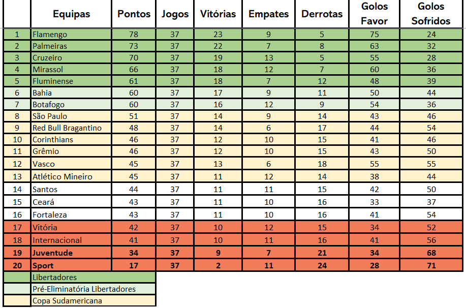 O Fortaleza continua a sua recuperação fantástica e depois de estar 27 jornadas no Z-4, a equipa saiu finalmente da zona de despromoção! Vitória sobre o Corinthians por 2 a 1 muito festejada pelos adeptos! Na última jornada a equipa defrontará o Botafogo no Nilton Santos e até poderá perder mas se o Internacional e o Vitória vencerem, nem o empate salva! Por isso para o Fortaleza ainda resta mais uma dura batalha antes de alcançar a manutenção.