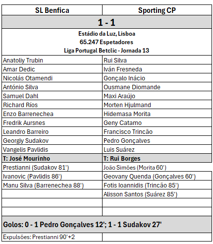 Quem entrou melhor no jogo foi o Sporting, com o golo de Pedro Gonçalves aos 12′ a dar justiça ao marcador. Mas os encarnados foram crescendo e especialmente depois do golo de Sudakov aos 27′, dominaram os bicampeões e o empate soube a pouco.