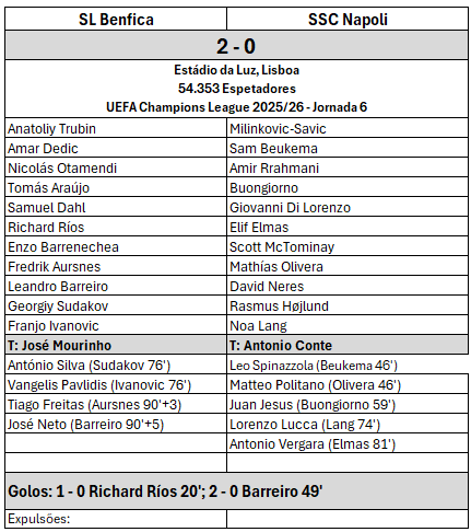O Benfica precisava de vencer para ainda acreditar que é possível atingir os playoffs. O Nápoles não estava tão mal na classificação mas só tinham 7 pontos. Os encarnados fizeram uma exibição a roçar a perfeição e venceram o campeão italiano por 2 a 0 e atingiram os 6 pontos, a 1 ponto do adversário italiano. A esperança voltou ao Estádio da Luz.