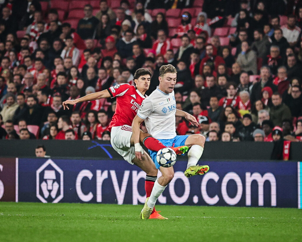 Rasmus Højlund e António Silva em luta pela posse da bola.