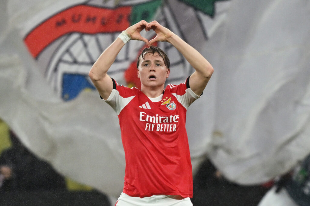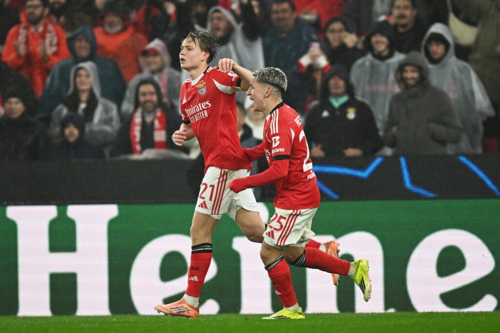 Andreas Schjelderup (Benfica) foi uma dor de cabeça para a defesa madridista e um dos grandes protagonistas da vitória épica do Benfica sobre o favorito Real Madrid – Foto Octavio Passos – UEFA/UEFA via Getty Images