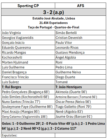 Sporting e AFS disputaram o último jogo dos quartos de final da Taça de Portugal, com o AFS a surpreender os leões depois de estarem a perder por 2 a 0. Duas grandes penalidades levaram o jogo para prolongamento, até ao golo de Geny Catamo aos 117′ a decidir a eliminatória.