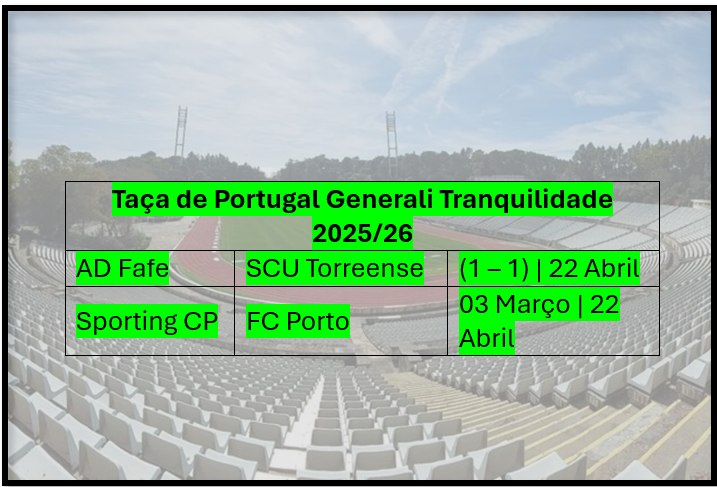 Jogos das meias finais. O Fafe vs Torreense já se realizou, com o resultado final a ser um empate a uma bola. Só em Abril se jogará a segunda mão. Sporting e Porto decidirão a outra vaga na final.